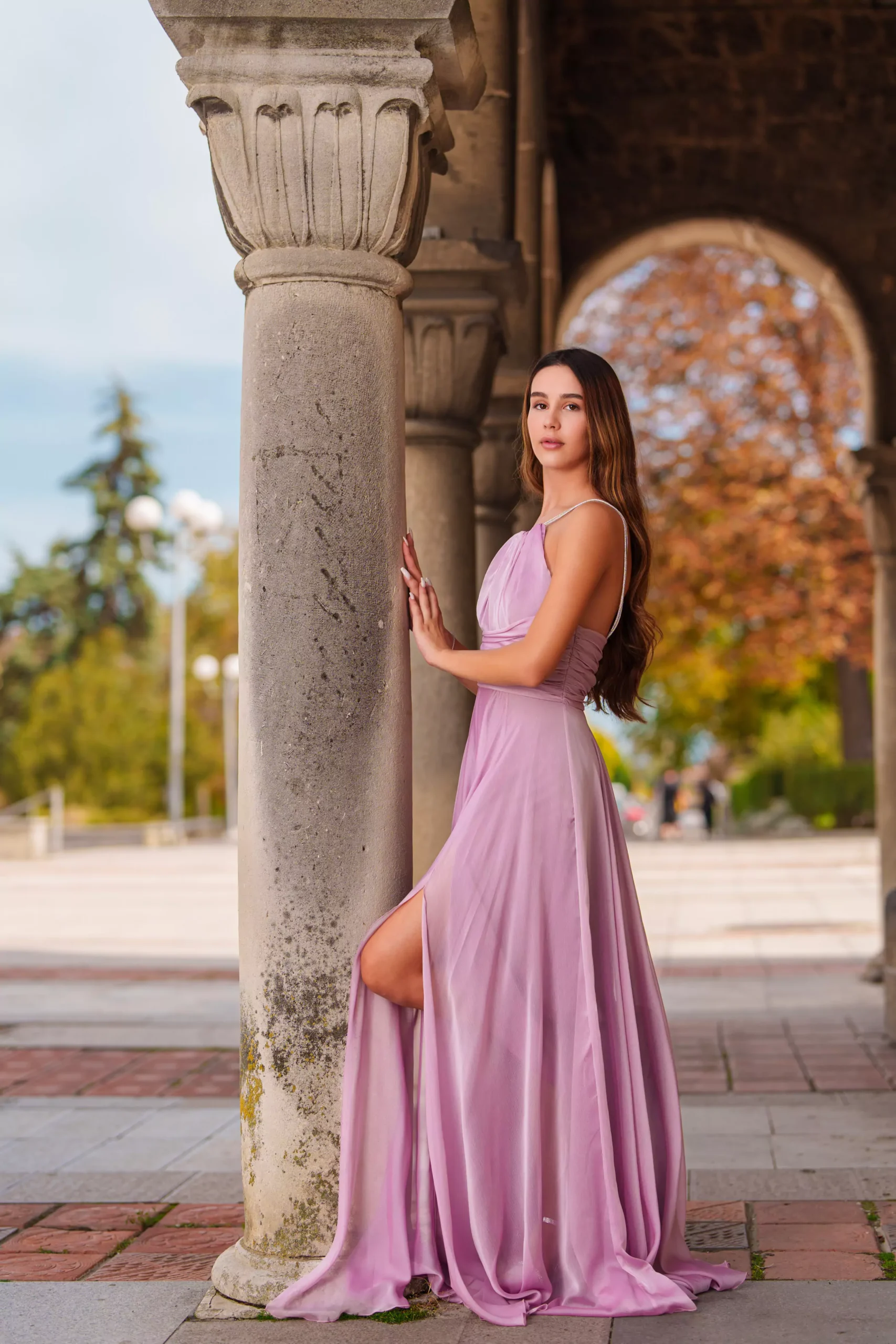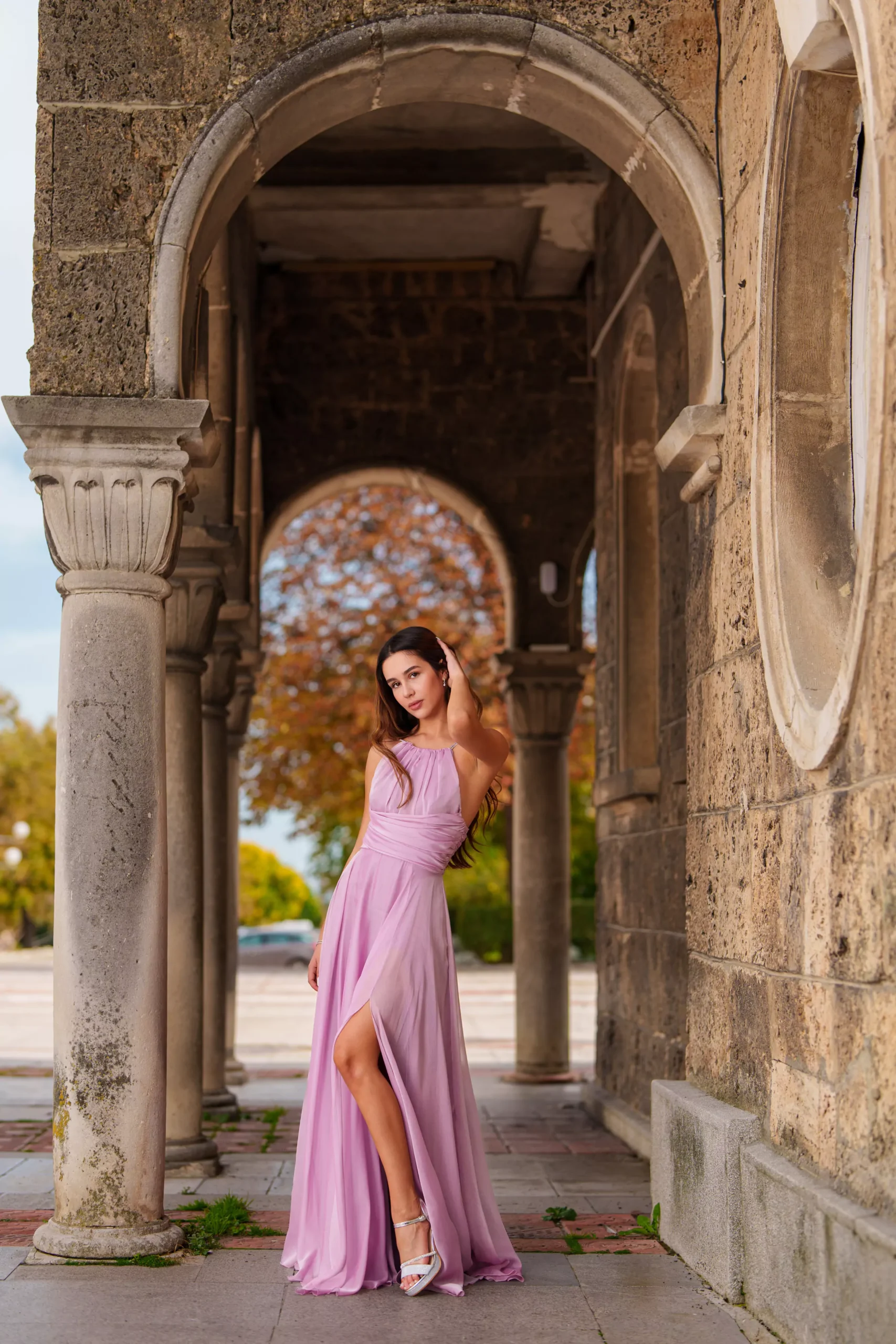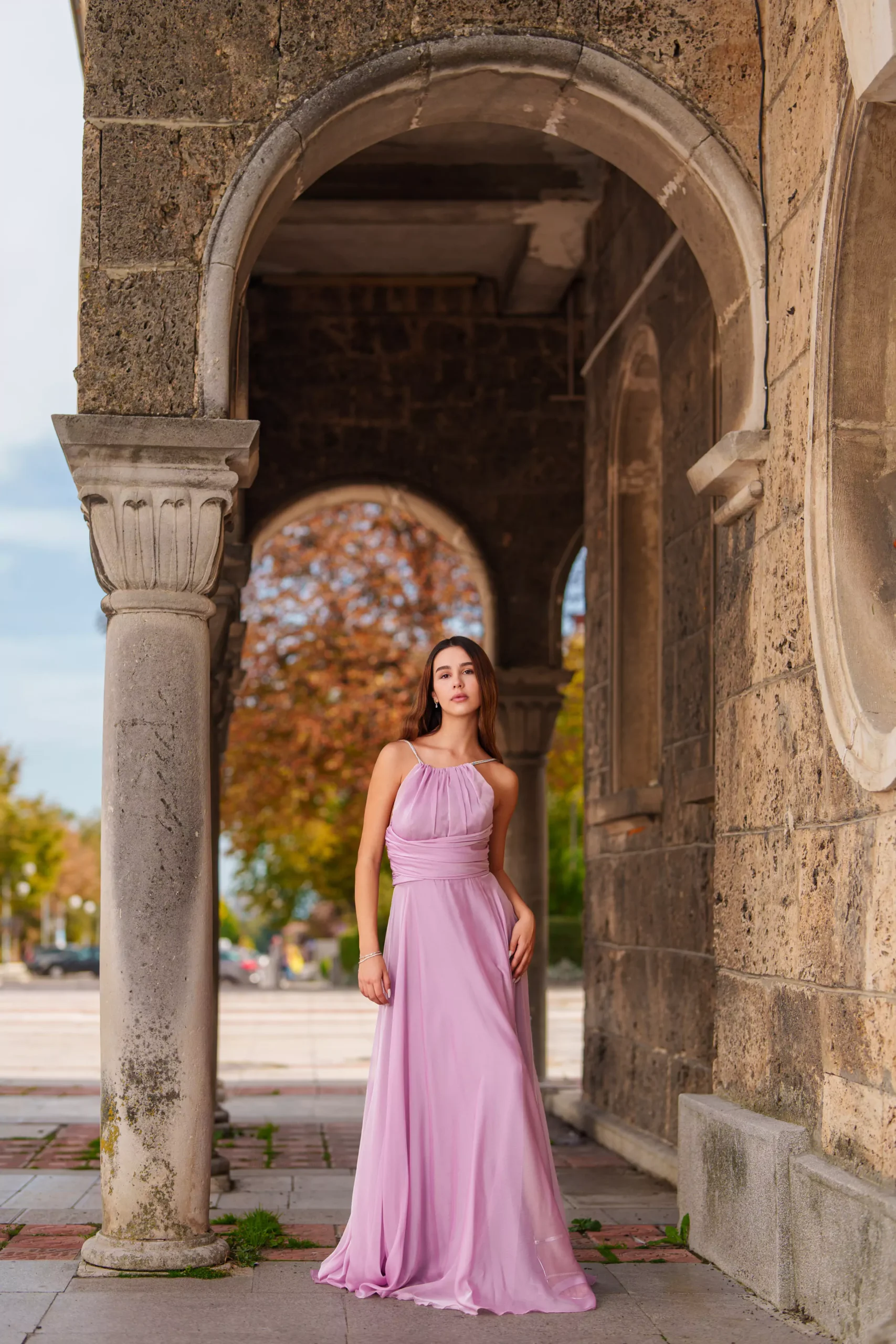Горната част е красиво драпирана, подчертавайки женствеността и създавайки уникален визуален ефект. Леката материя пада свободно, което придава изисканост и ефирност на силуета.