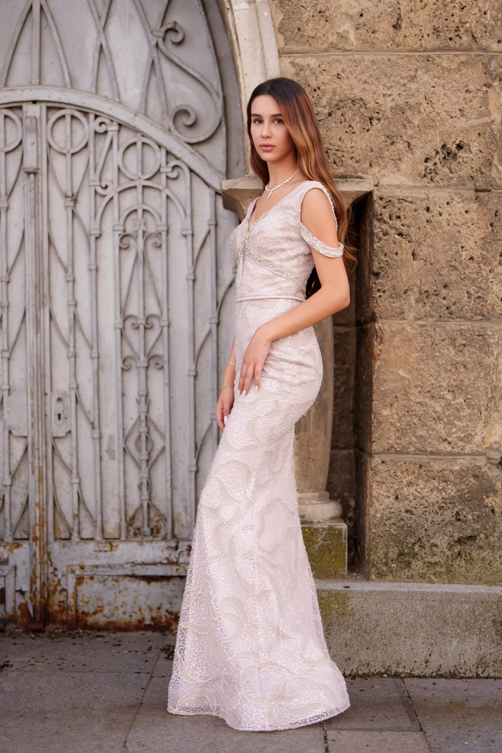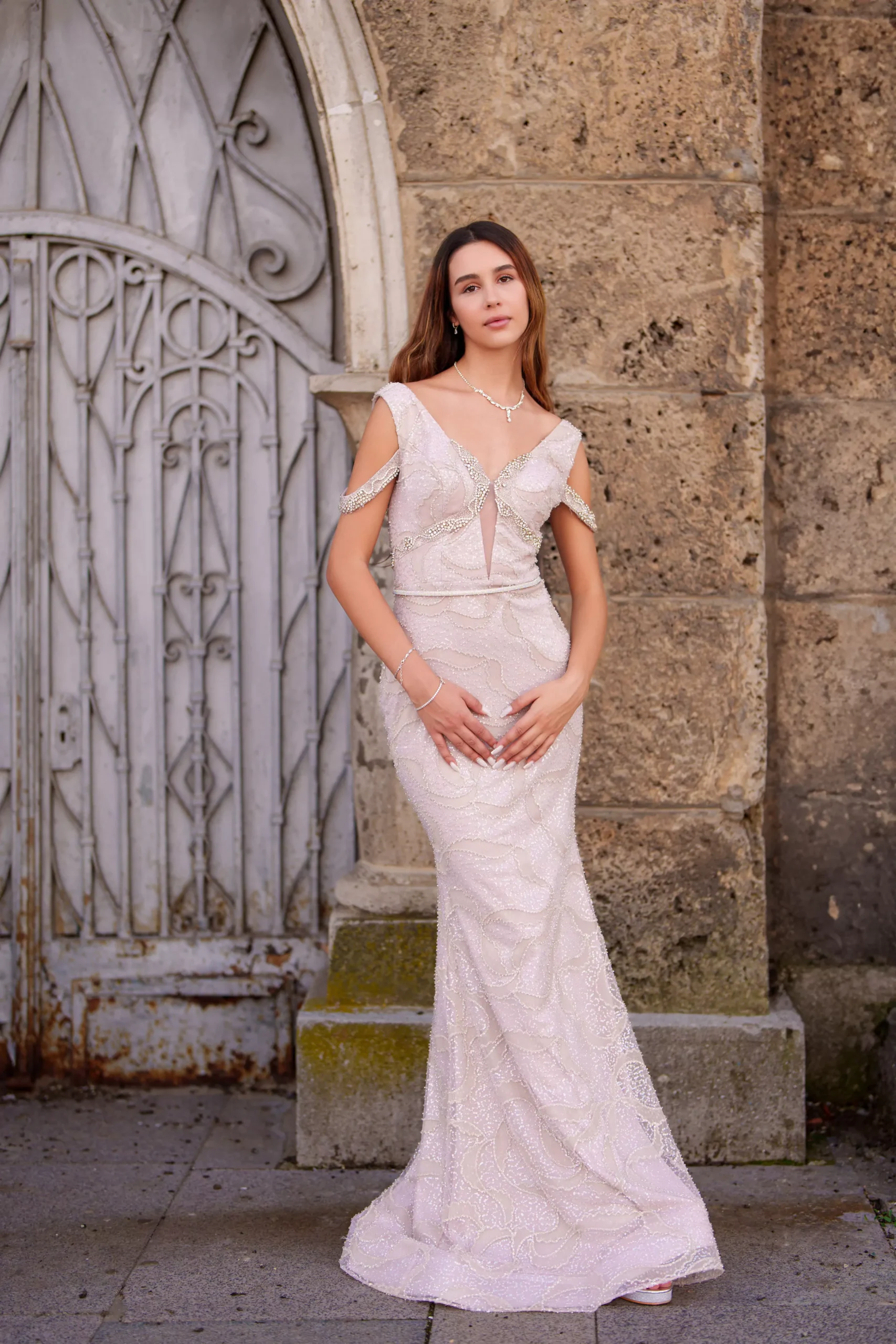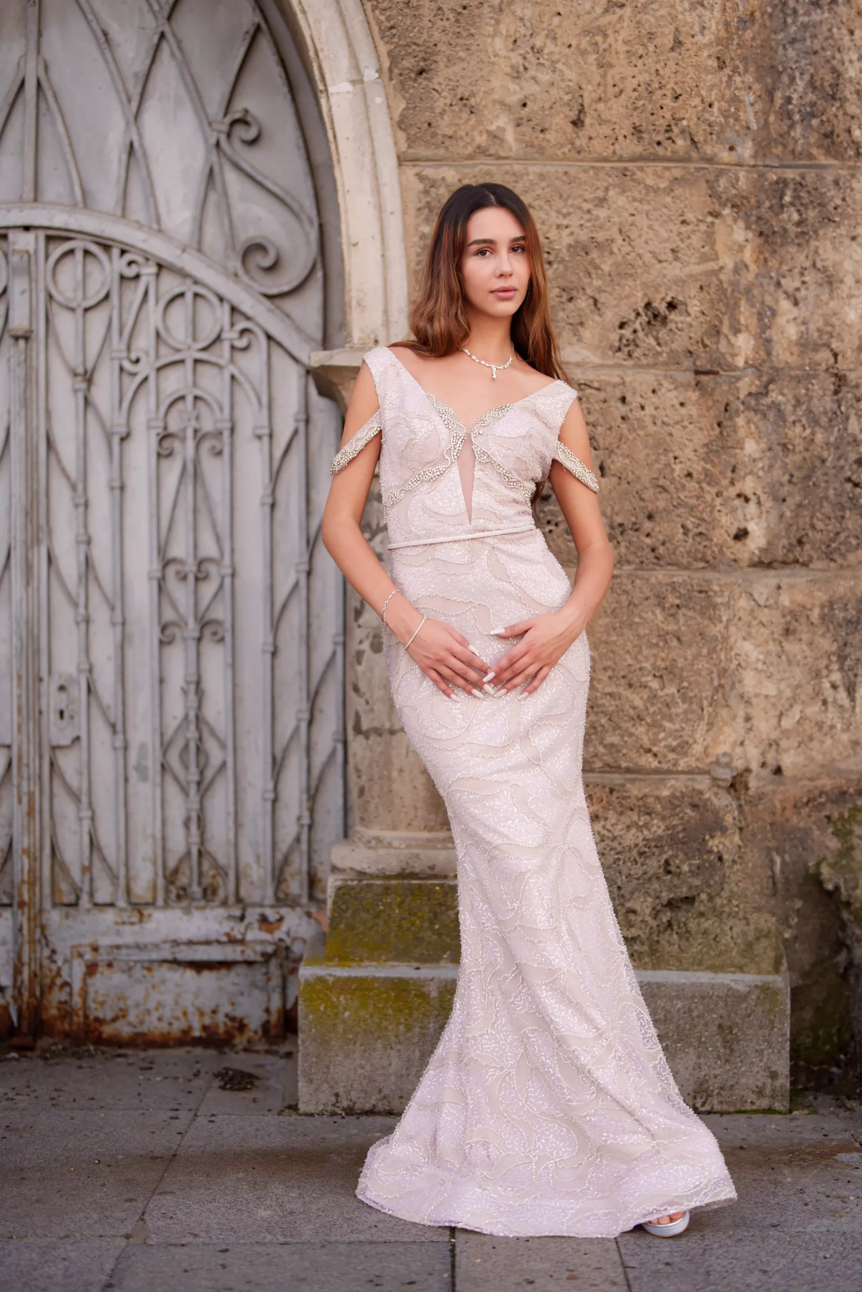 Горната част разполага с деликатни декорации и открити рамене, създавайки изтънчен и привлекателен силует. Елегантните детайли по роклята подчертават нежността и създават усещане за класическа красота.