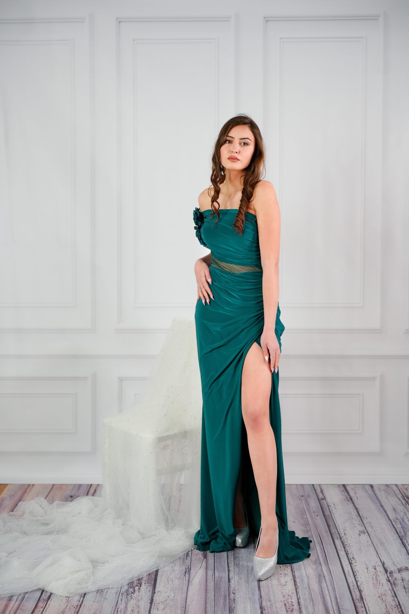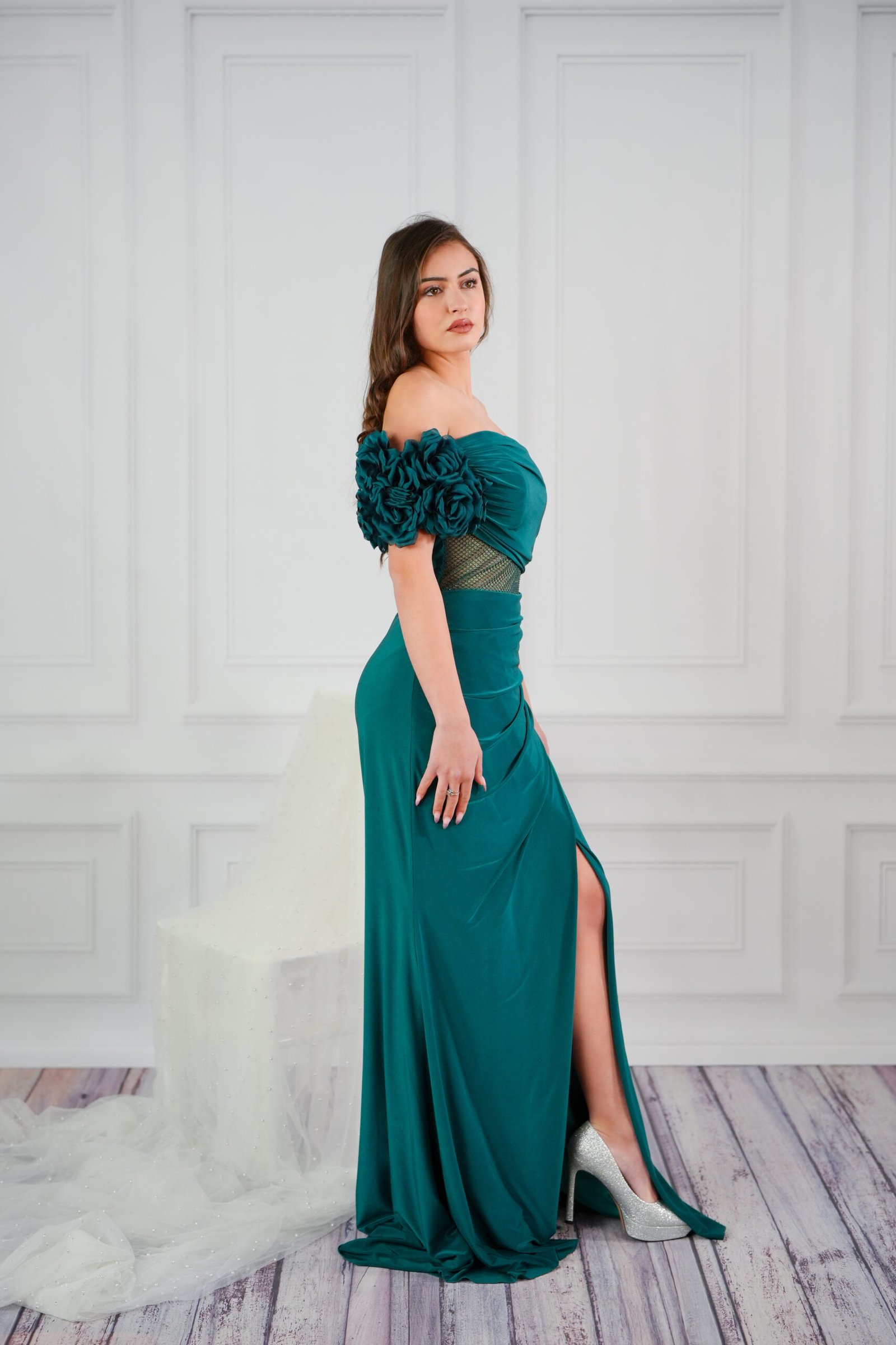 Тази елегантна дълга рокля в дълбок изумруденозелен цвят е идеалният избор за специални поводи. Оф-шейдър силуетът с богато украсено рамо от 3D цветя придава романтично излъчване и грация. Елегантно набраната материя оформя тялото, подчертавайки естествените линии.