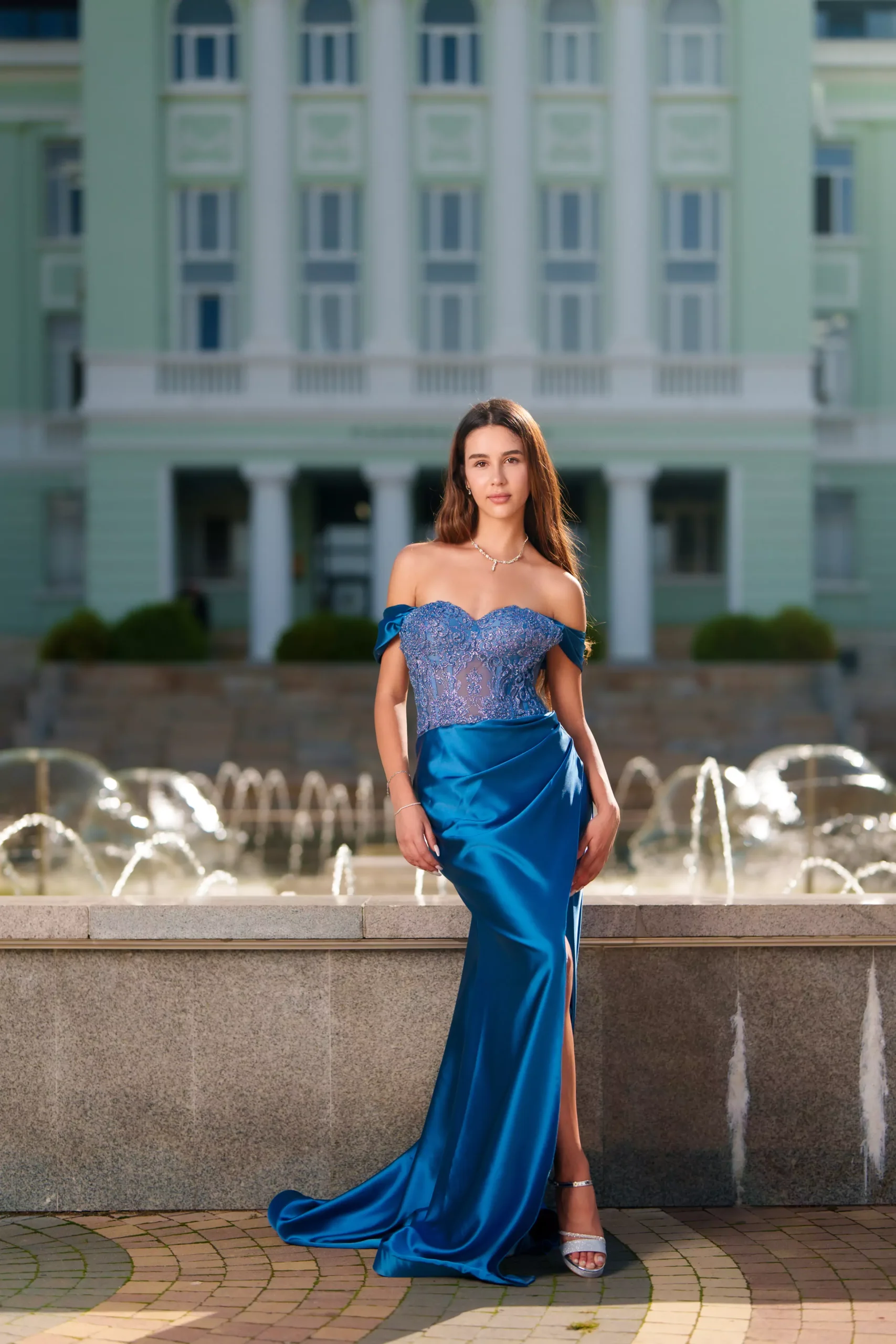 Горната част е украсена с деликатна дантела и открити рамене, придаващи финес и романтика на визията. Полата пада нежно с ефектен сатенен блясък и висока цепка, която добавя нотка на драматичност и изтънченост.