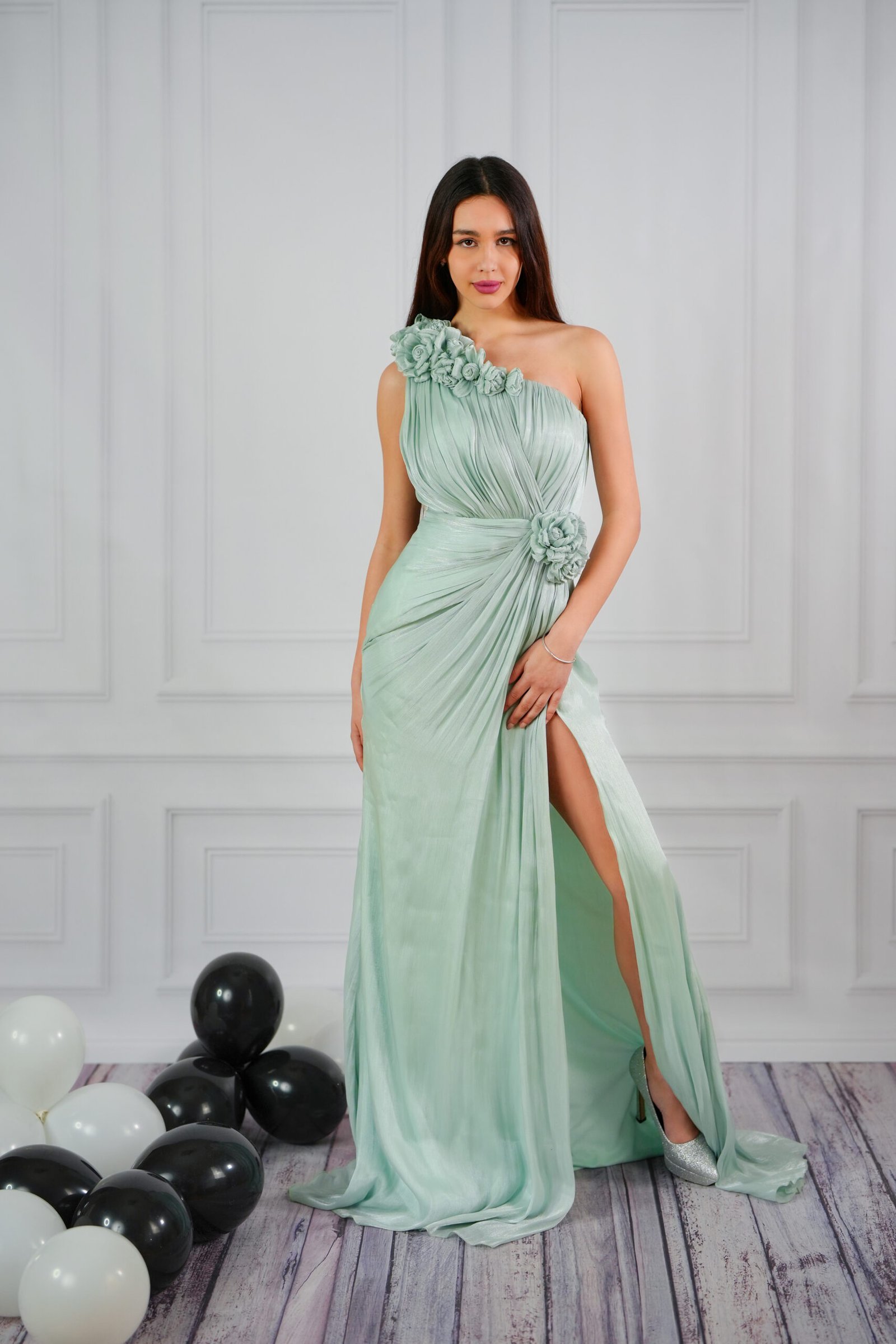 Елегантна дълга рокля в нежен ментов нюанс, която излъчва изисканост и романтика. Асиметричният дизайн с едно рамо е допълнен от изящни флорални апликации, които придават деликатен и женствен завършек. Фините плисета подчертават талията и придават динамика на силуета.