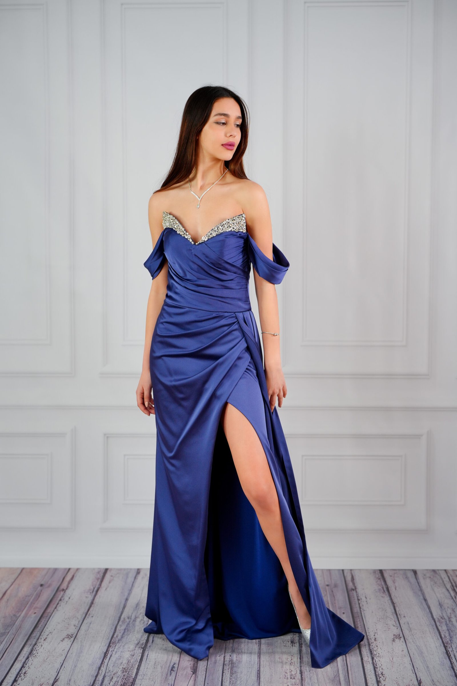 Тази елегантна дълга рокля в наситено роялносин цвят е създадена за специални поводи. Корсетният бюст е украсен с изящни камъни, които добавят блясък и изисканост. Драпираният силует приляга по тялото, оформяйки изтънчена визия.