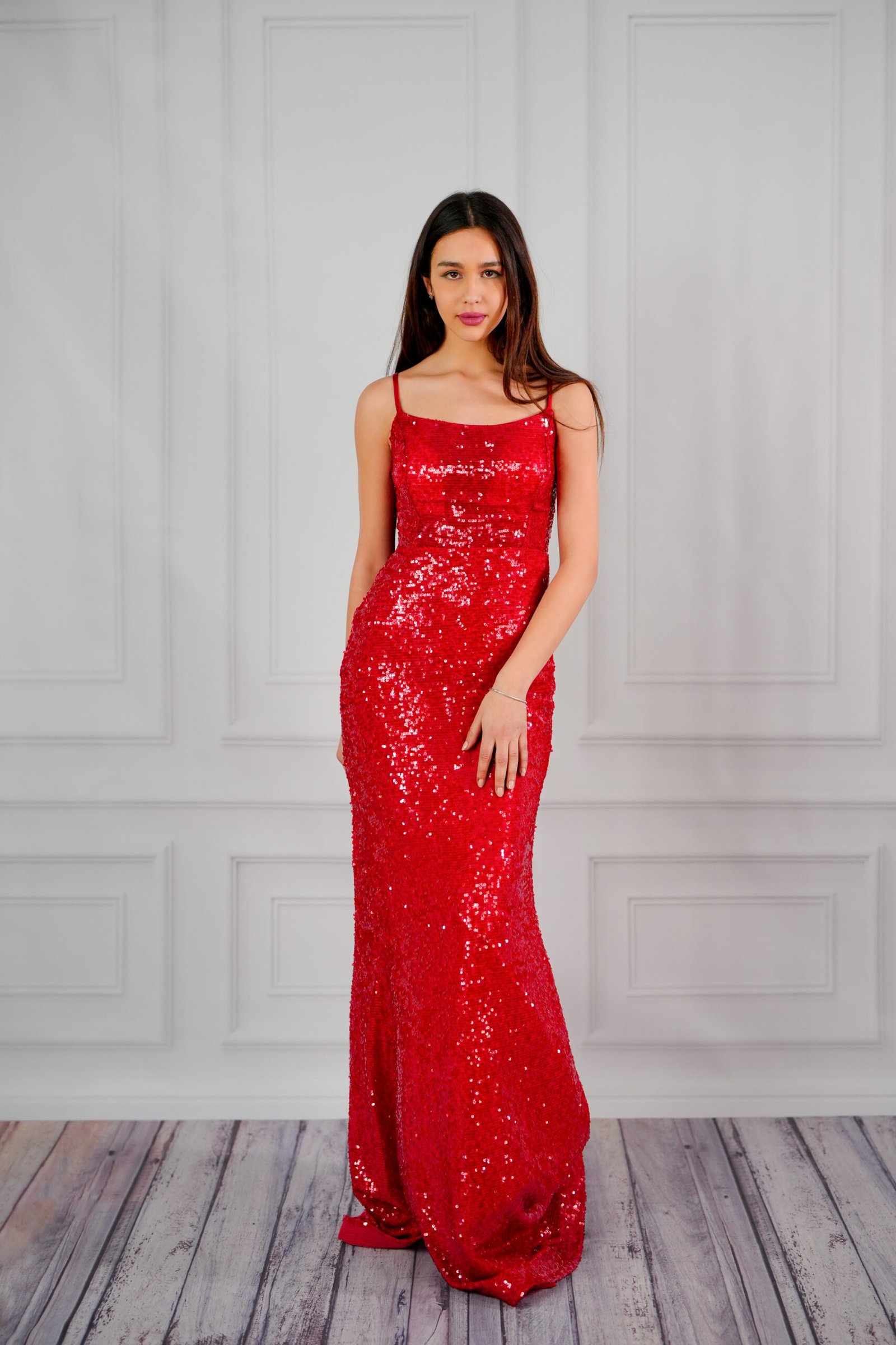 Тази зашеметяваща дълга рокля в наситено червен цвят е идеалният избор за вечери, които изискват стил и блясък. Цялостно покрита с фини пайети, тя улавя светлината и създава ефектен, сияен завършек. Елегантният силует с тънки презрамки подчертава раменете и придава изтънченост на визията.
