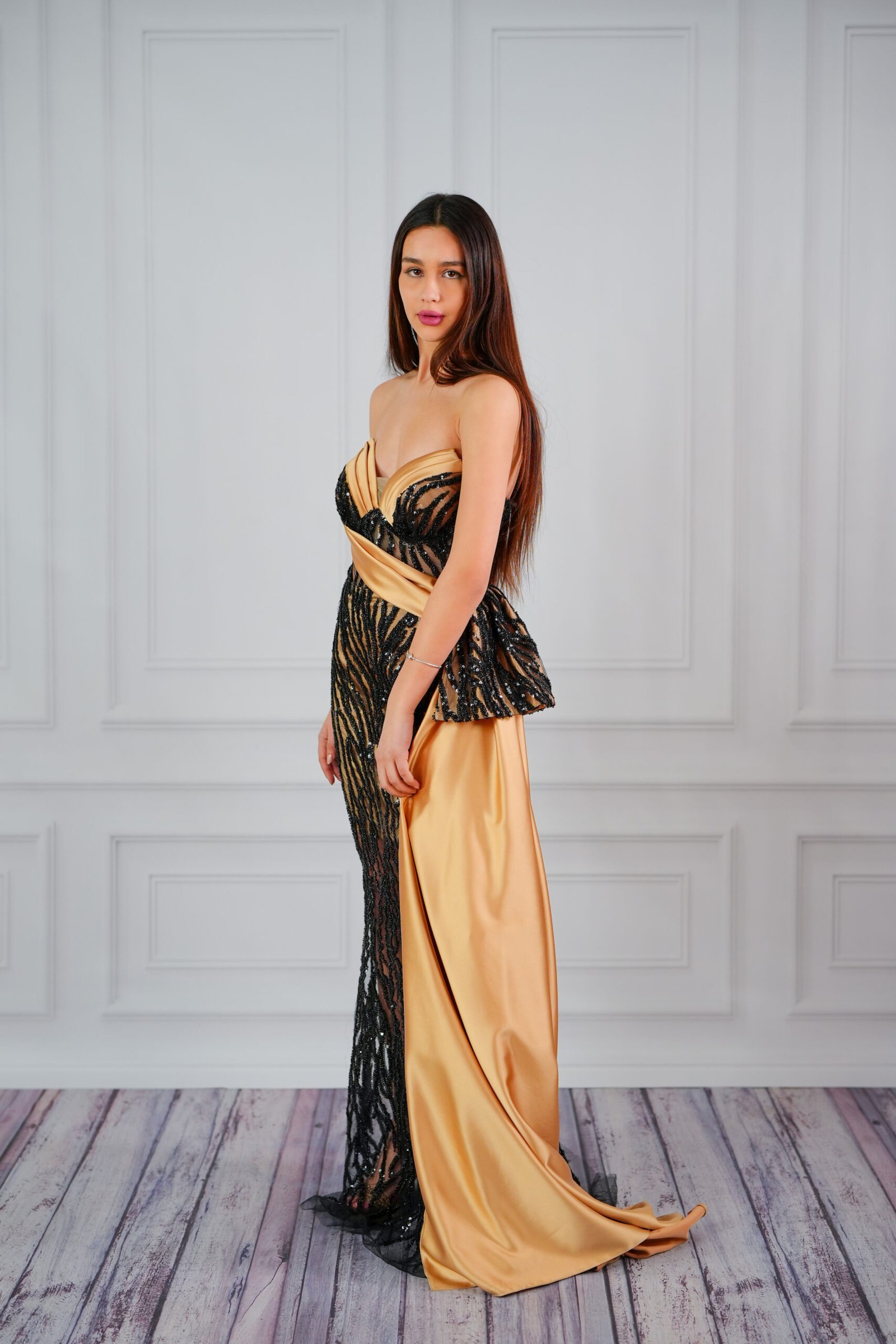 Долната част впечатлява с прилепнал силует, който плавно преминава в ефектен златист шлейф. Луксозната материя и прецизната изработка правят тази рокля идеален избор за гала вечери, официални събития и специални поводи, където стилът и блясъкът са на първо място.