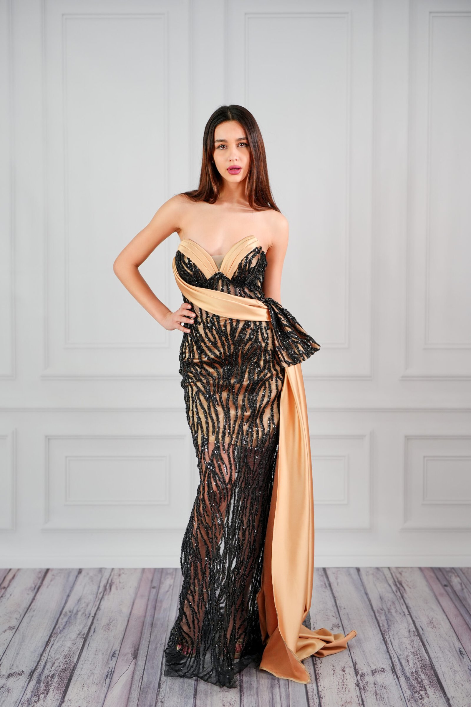 Зашеметяваща дълга рокля в черно и златисто, създадена за жени, които искат да впечатлят. Корсетът е с елегантна асиметрична драпировка и прозрачни детайли, които придават изтънченост и загадъчност.